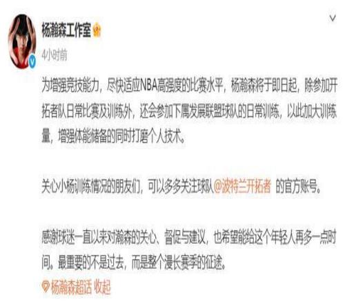 隨后,楊瀚森工作室更新社媒發聲:“為增強競技能力,盡快適應NBA高強度的比賽水平,楊瀚森將于即日起,除參加開拓者隊日常比賽及訓練外,還會參加下屬發展聯盟球隊的日常訓練,以此加大訓練量,增強體能儲備的同時打磨個人技術?!?/p>
